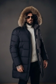 Подовжена чоловіча зимова куртка з натуральним хутром лисиці темно-синя